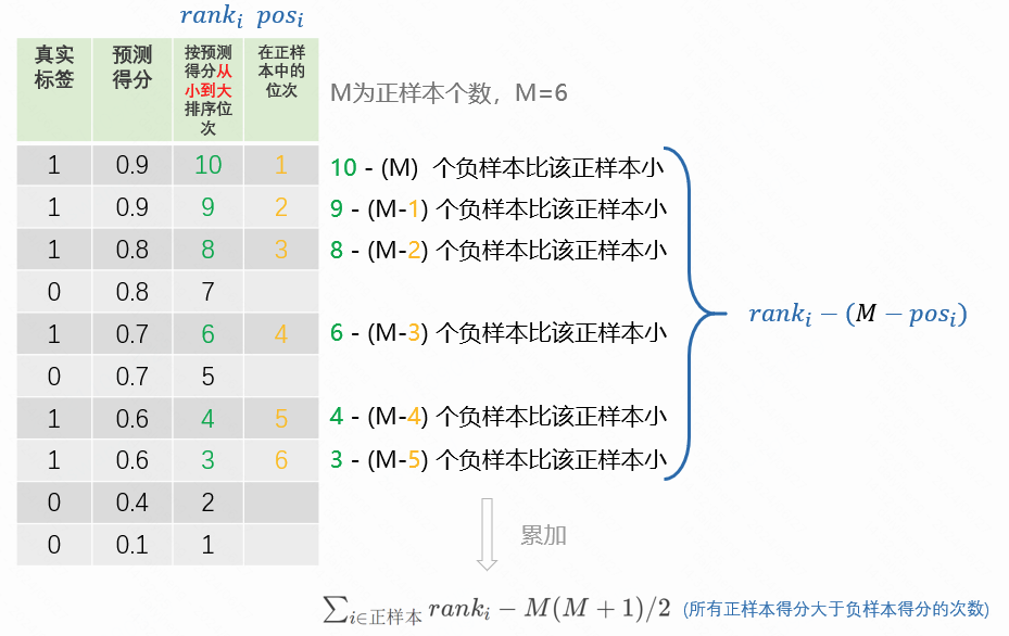 AUC为正样本得分大于负样本得分的概率,但是穷举正负样本对太复杂,可以先根据得分从小到大排序,然后找出每个正样本的排序位次。计算出每个位次下负样本的个数,就是该正样本得分大于负样本得分的次数,对次数进行累加就是所有正样本得分大于负样本得分的次数,除以就是所有正样本得分大于负样本得分的概率,如下图所示: