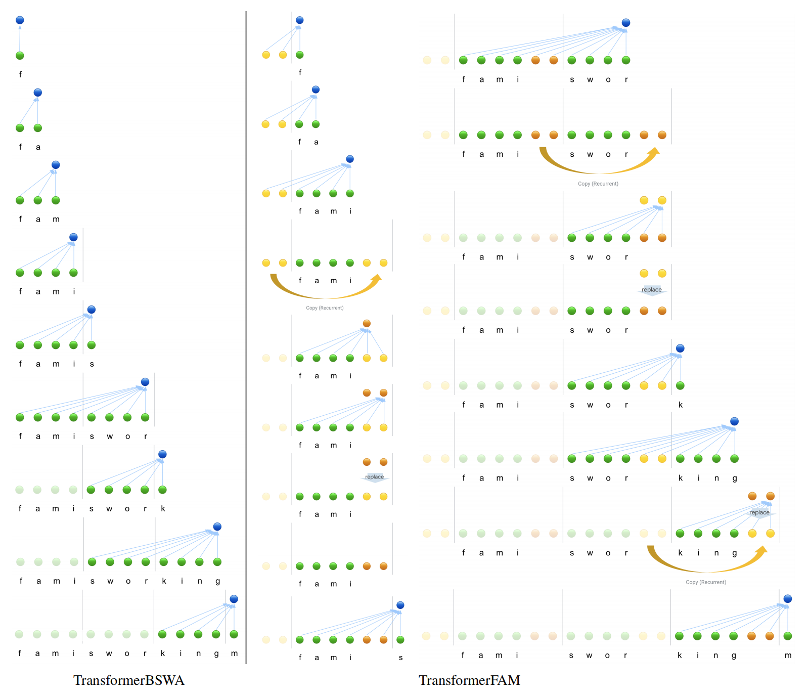 看了半天没看懂咋做的,然后看到了附录里的这张图,秒懂,这张图为啥要放附录里!……这篇论文关于将Transformer的推理降到O(n)的方式是类似于滑动窗口(Block Sliding Window Attention, BSWA)的操作,但做的改进是添加了一部分长期记忆(称之为Feedback Loop),其窗口内一部分是短期记忆,一部分是长期记忆,进行了一定的权衡。目前在将推理时间复杂度降低到一次时间复杂度的方法大抵如此,Mamba也是类似于通过了一种记忆模块,随着时间的推移逐步遗忘之前的元素。