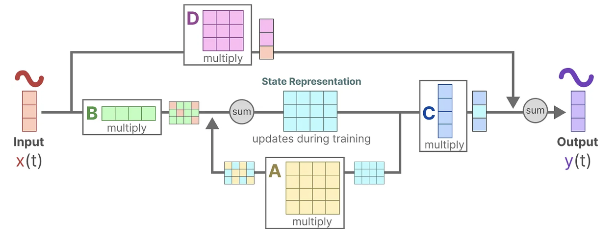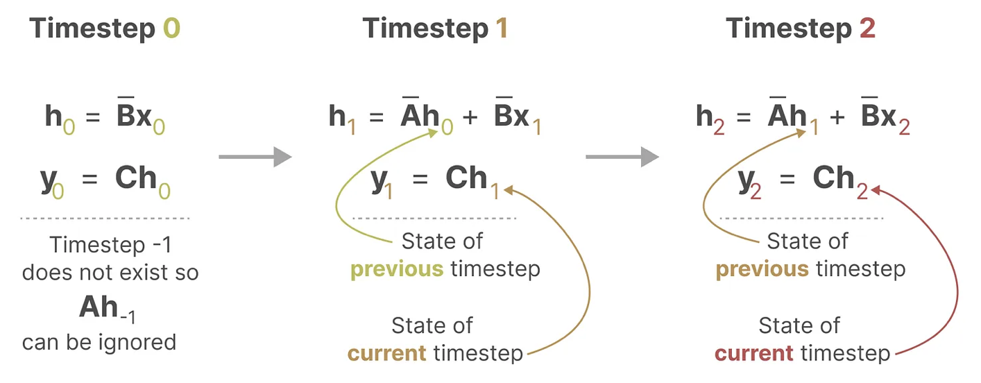 离散 SSM 允许可以用离散时间步长重新表述问题,在每个时间步,都会涉及到隐藏状态的更新(比如取决于和的共同作用结果,然后通过预测输出)。