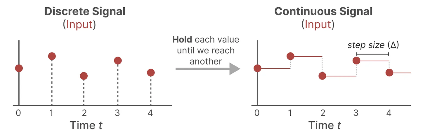 由于除了连续的输入之外,还会通常碰到离散的输入(如文本序列),不过,就算SSM在离散数据上训练,它仍能学习到底层蕴含的连续信息,因为在SSM眼里,sequence不过是连续信号signal的采样,或者说连续的信号模型是离散的序列模型的概括。那模型如何处理离散化数据呢?答案是可以利用零阶保持技术(Zero-order hold technique)。