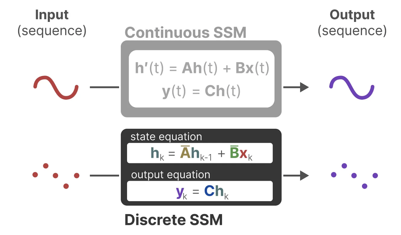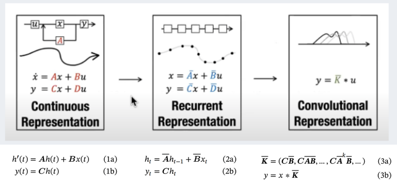 总之,这两个方程共同旨在根据观测数据预测系统的状态,且考虑到输入一般都是连续的,因此SSM的主要表示是连续时间表示( continuous-time representation )
