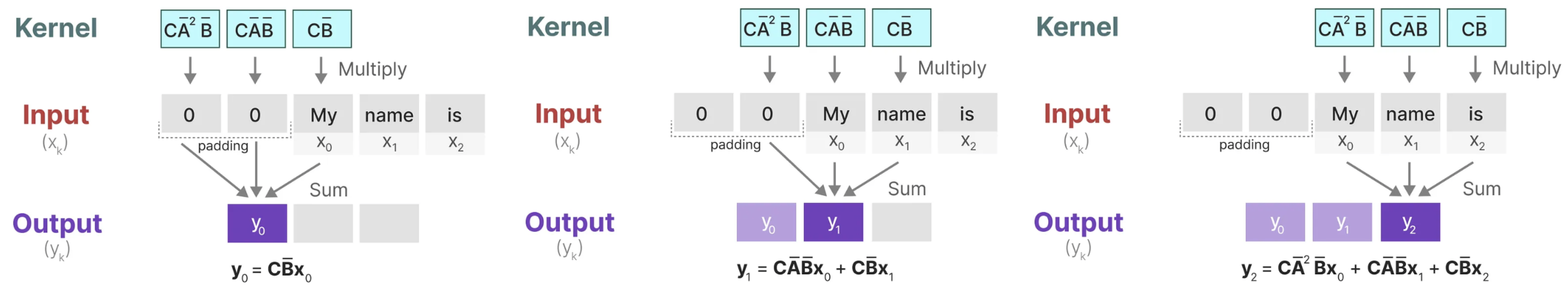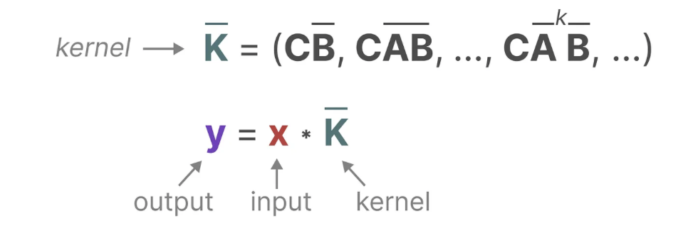 由于其中三个离散参数A、B、C都是常数,因此我们可以预先计算左侧向量并将其保存为卷积核,这为我们提供了一种使用卷积超高速计算y的简单方法,如以下两个方程所示: