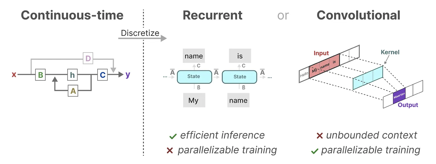 至此,总结一下,将 SSM 表示为卷积的一个主要好处是它可以像卷积神经网络CNN一样进行并行训练。然而,由于内核大小固定,它们的推理不如 RNN 那样快速。