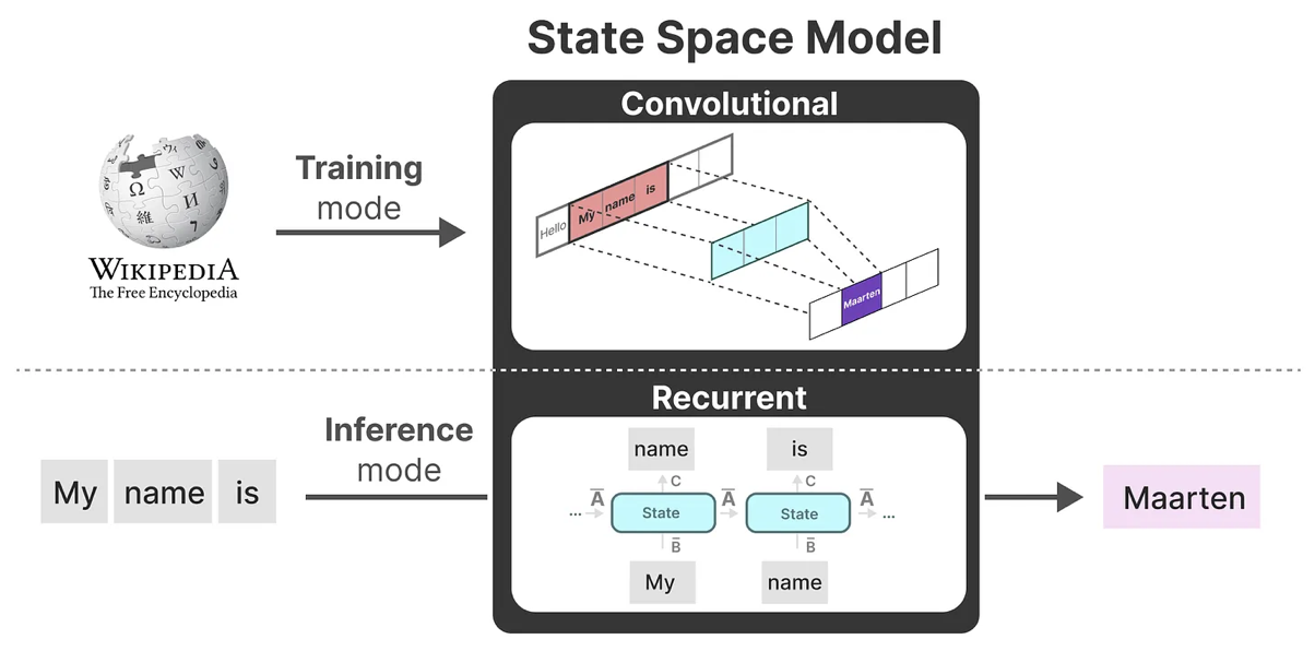 从图中可以看到,模型可以用两种方式计算,即线性递归(2)或全局卷积(3),模型通常使用卷积模式(3)可以进行高效的并行化训练,并切换到循环模式(2)以高效的自回归推理(其中输入每次只看到一个时间步)。