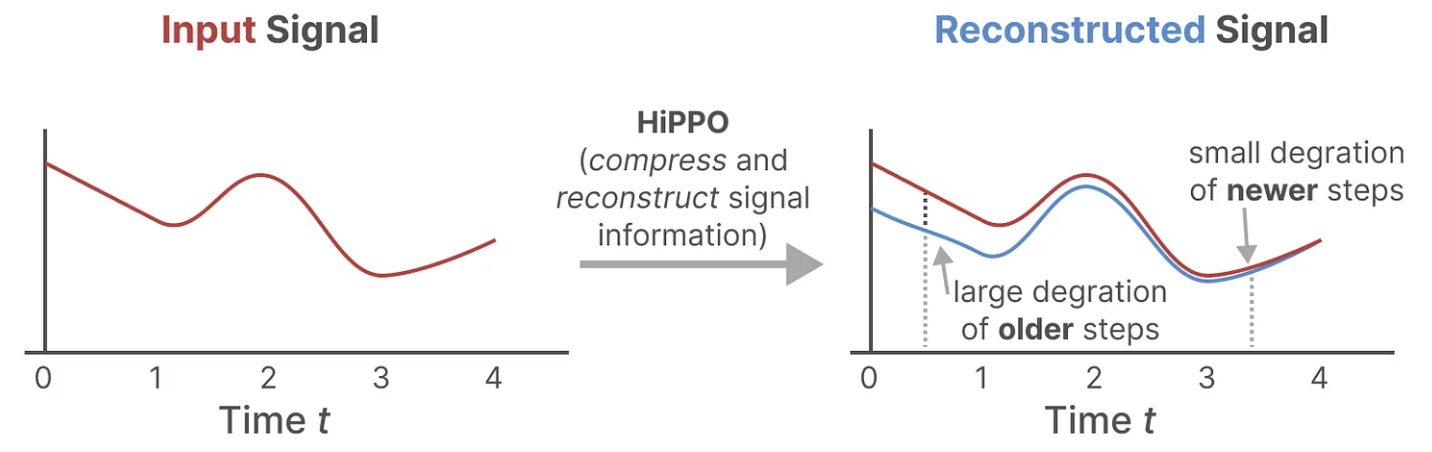 HiPPO尝试将当前看到的所有输入信号压缩为系数向量(HiPPO attempts to compress all input signals it has seen thus far into a vector of coefficients)。