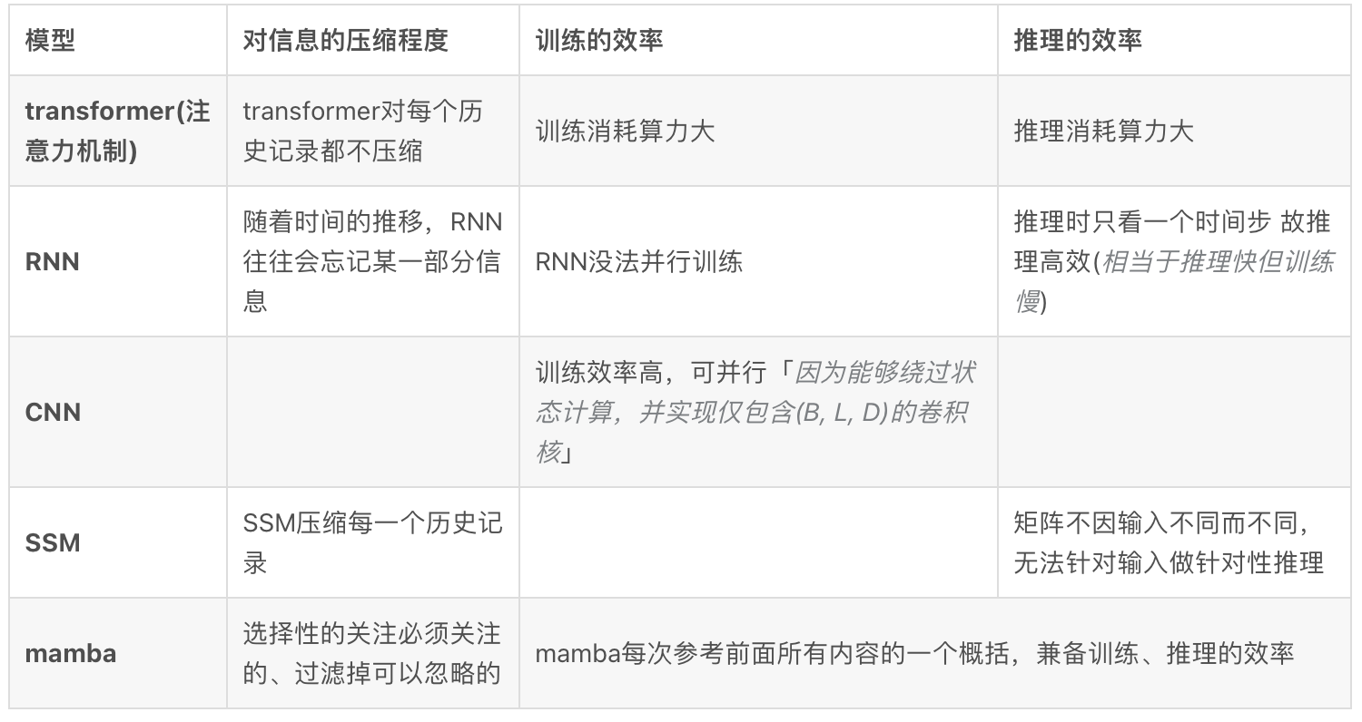 最终,Mamba的解决办法是,相比SSM压缩所有历史记录,mamba设计了一个简单的选择机制,通过“参数化SSM的输入”,让模型对信息有选择性处理,以便关注或忽略特定的输入. 这样一来,模型能够过滤掉与问题无关的信息,并且可以长期记住与问题相关的信息. 好比,Mamba每次参考前面所有内容的一个概括,越往后写对前面内容概括得越狠,丢掉细节、保留大意.