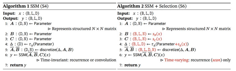最后,在Mamaba中,作者让B矩阵、C矩阵、成为输入的函数,让模型能够根据输入内容自适应地调整其行为: