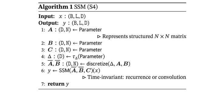 - 作为从输入信号到输出信号的参数化映射,SSMs可以当做是RNN与CNN的结合「These models can be interpreted as acombination of recurrent neural networks (RNNs) and convolutional neural networks (CNNs)」,即推理用RNN结构,训练用CNN结构,这就是Mamba最无敌的地方。