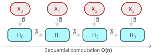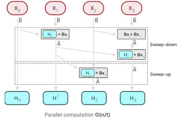 每个状态比如都是前一个状态比如乘以,加上当前输入乘以的总和,这就叫扫描操作(scan operation),可以使用 for 循环轻松计算,然而这种状态之下想并行化是不可能的(因为只有在获取到前一个状态的情况下才能计算当前的每个状态)。