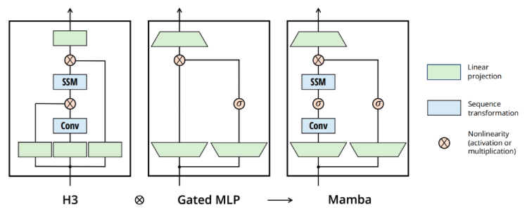 将大多数SSM架构比如H3的基础块,与现代神经网络比如transformer中普遍存在的门控MLP相结合,组成新的Mamba块,重复这个块,与归一化和残差连接结合,便构成了Mamba架构: